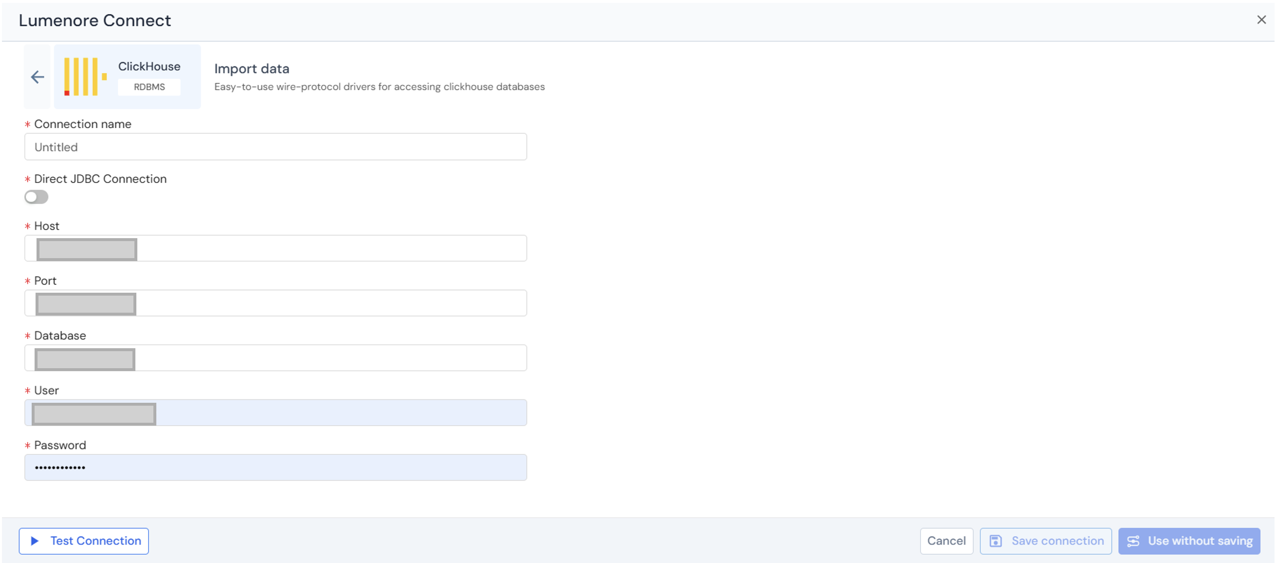 The ClickHouse connector integrates Lumenore with ClickHouse, a column-oriented, high-performance analytical database designed to handle large data volumes with extremely fast query performance. Using easy-to-use wire-protocol drivers, users can securely connect to ClickHouse and import data into Lumenore for real-time reporting. Once connected, teams can build dashboards, run advanced analytics, and perform AI-driven insights on massive datasets without complex data movement, while also managing and reusing connections from the existing connections list.