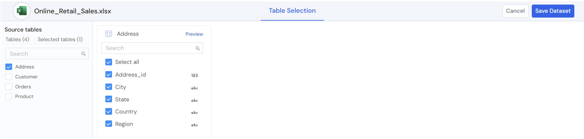 - Select the table and finally save the dataset.