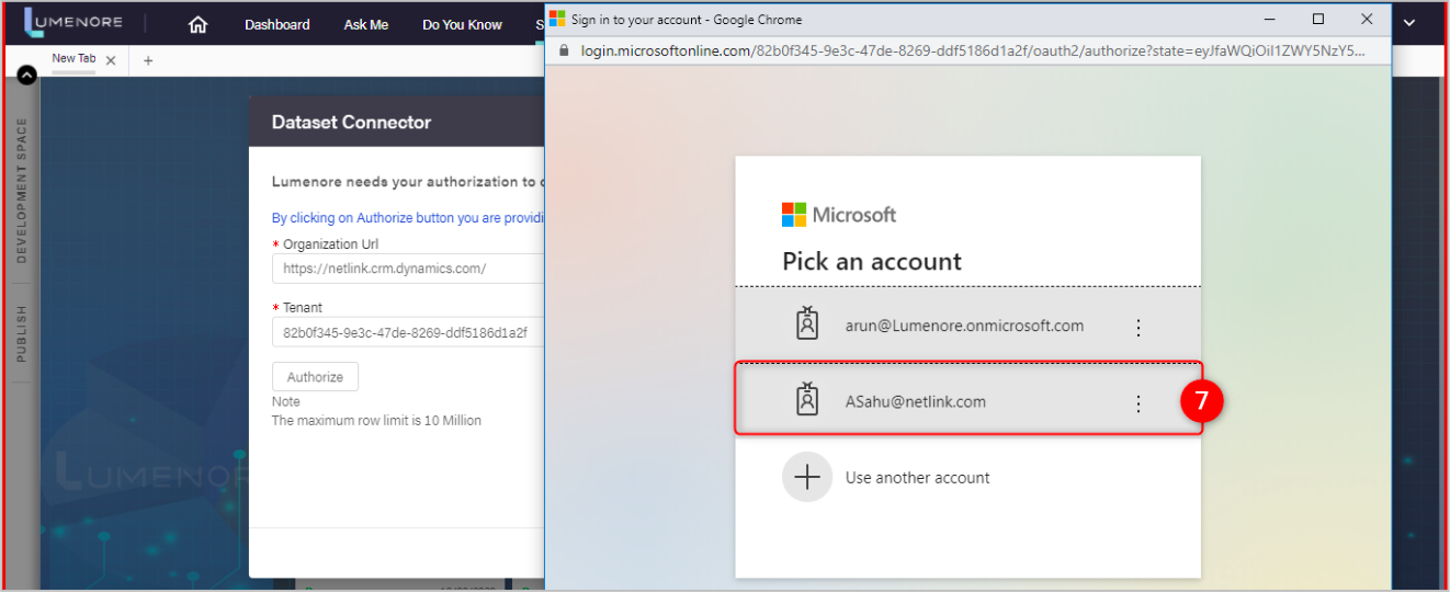 E.g., If your URL is https://crm.your-systems.com/your-system/main.aspx. You should copy “https://crm.your-systems.com/your-system/” and paste it in the “Lumenore Dynamic 365 Connector Screen.”
