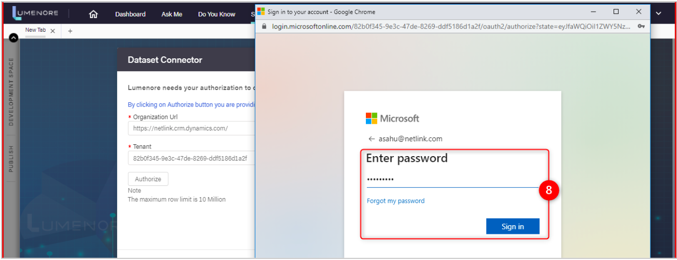 - Then, paste the copied link into the “Lumenore Dynamic 365 connector screen,” as well as your email and password and proceed with your CRM migration.