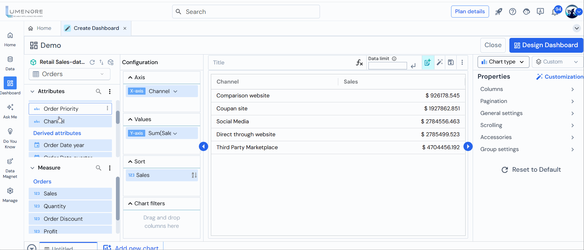 Step 7: Users can apply chart filters to both attributes and measures.