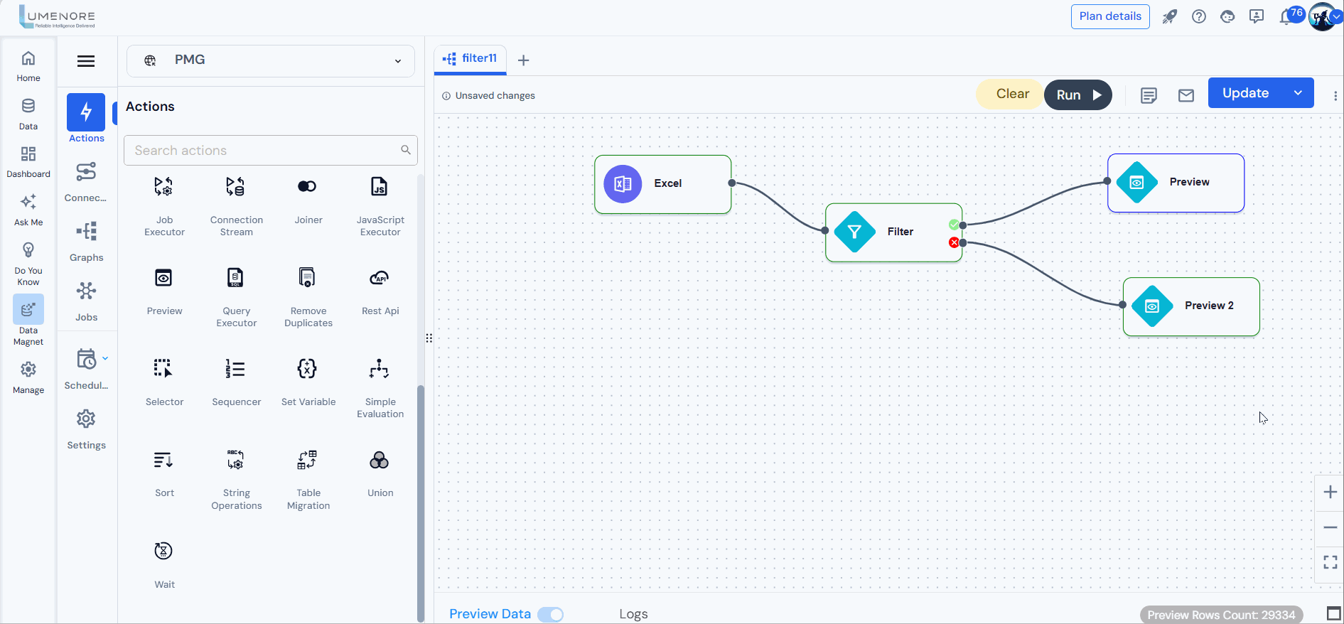 The Filter function selects specific columns or rows based on a condition or expression. It helps you narrow down your data so that only the information that meets your criteria is passed to the next step.