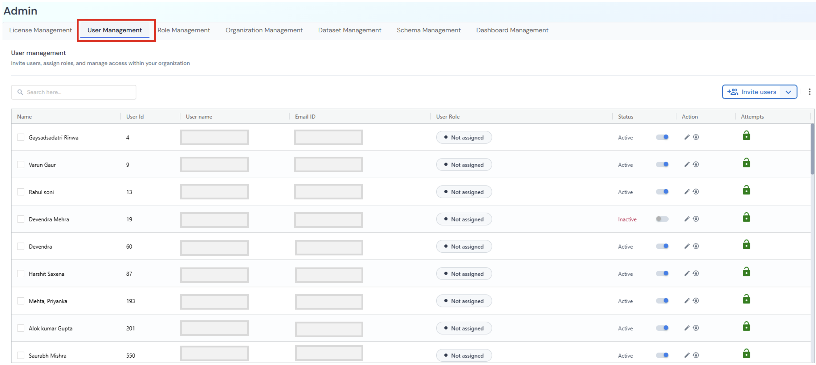 User Management tab, where admins can view users and their associated roles, and perform actions.