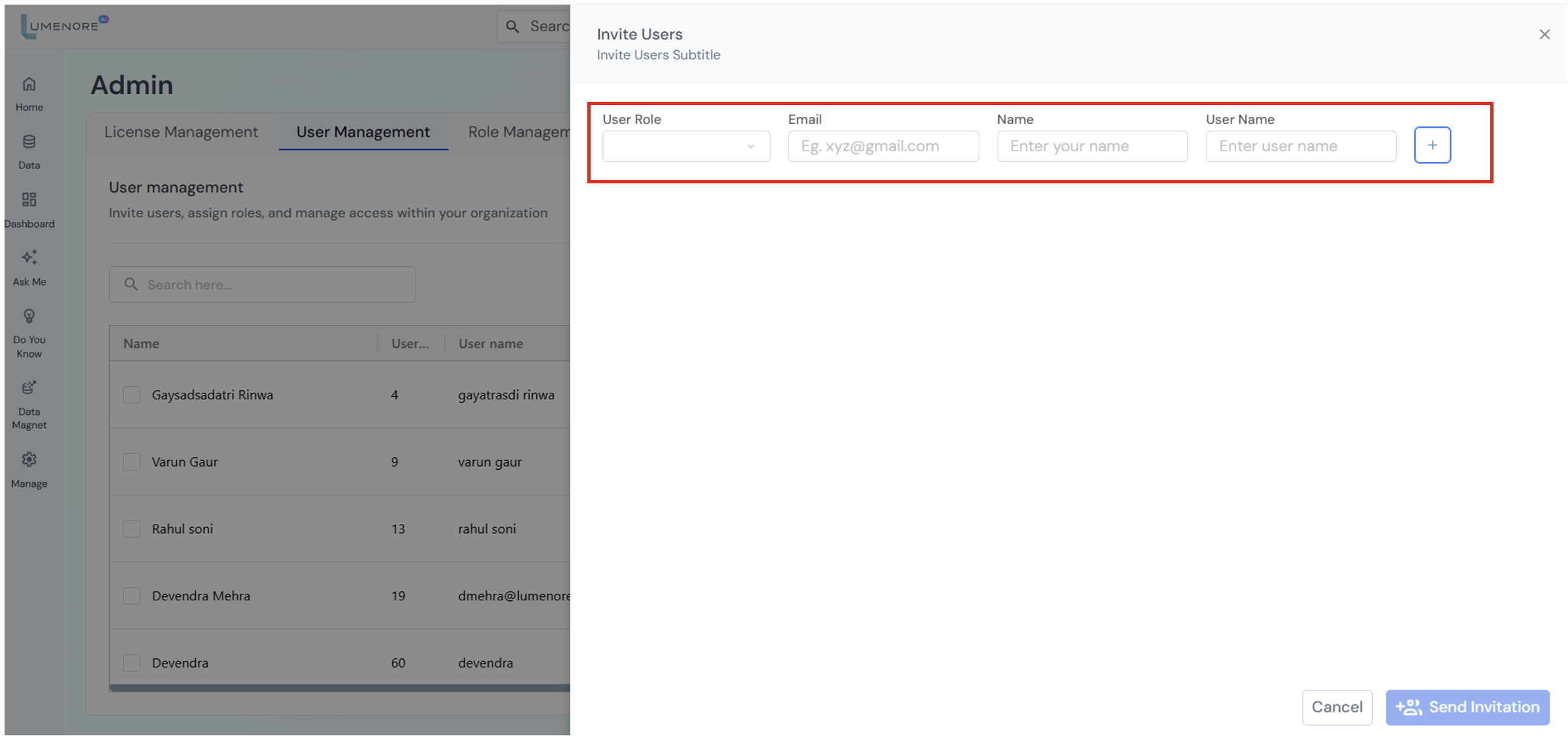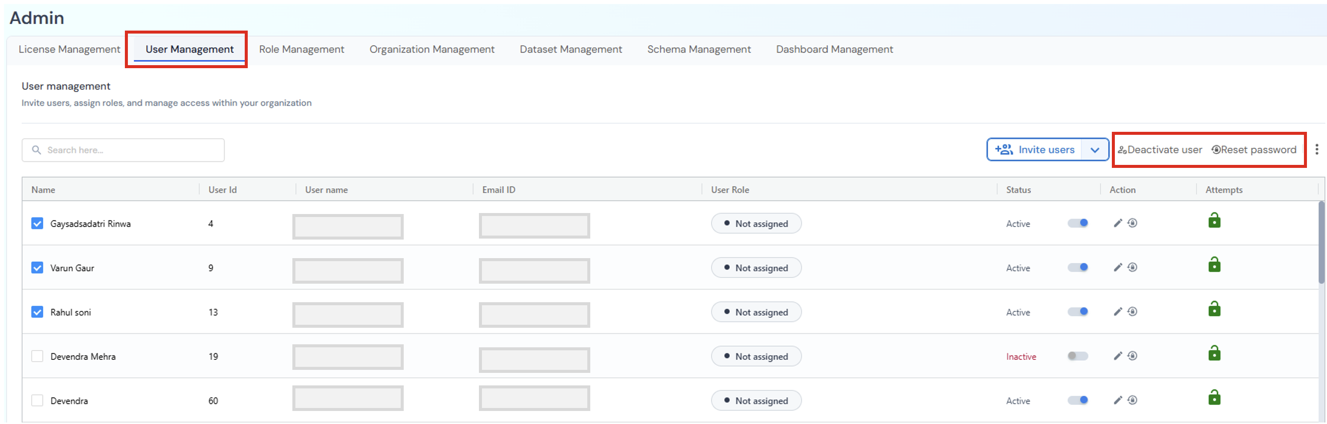 - Selection Checkbox: Allows selecting one or multiple users to perform bulk actions: