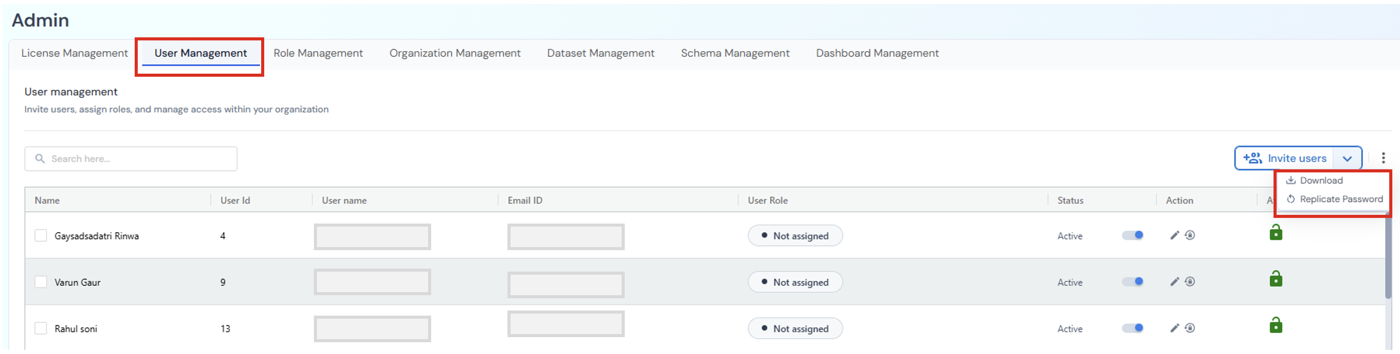 - Replicate Password: Allows the admin to replicate passwords, perhaps to reset or synchronize them across different accounts.