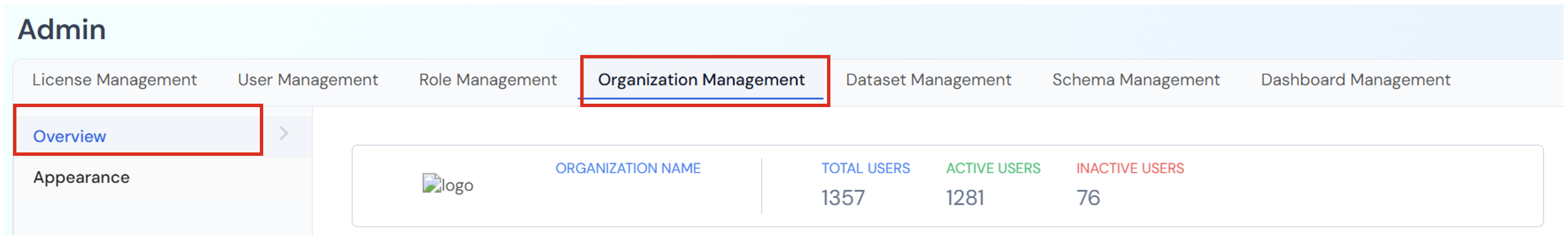 The Organization Management section enables administrators to oversee organization-level settings and track user statistics within the platform. It provides a centralized hub for managing organizational configurations, monitoring user activity, and ensuring consistency across the platform.