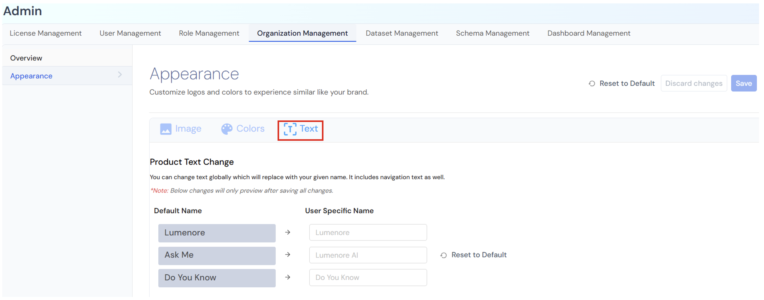 The Appearance section within Organization Management enables administrators to tailor the platform’s visual branding to match their organization’s identity. It offers options to customize logos, colors, and text, ensuring a cohesive and branded user experience.